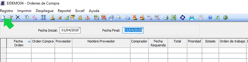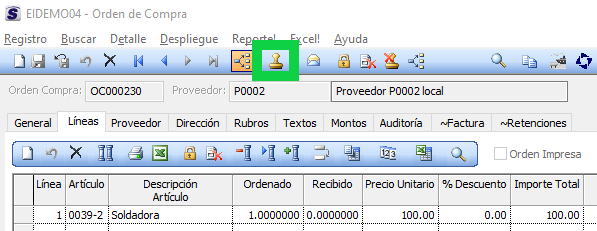 Cuando aparece la orden, en la parte superior del documento, debes elegir el proveedor. Si no se conoce el código, puedes dar doble clic al campo y aparecerán los posibles proveedores.