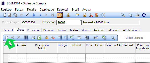 Para agregar las líneas de la orden, debes ir a la carpeta líneas y presionar “nuevo” para cada nueva línea (hay que observar que hay dos botones de “nuevo”. El de arriba crea una nueva orden de compra, mientras que el de abajo, crea una nueva línea para la orden en la cual se está).