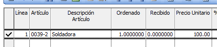 Al agregar una nueva línea, solo es obligatorio capturar el código del artículo (si no lo conoces debes dar doble clic y lo puedes buscar), la cantidad ordenada y el precio unitario.