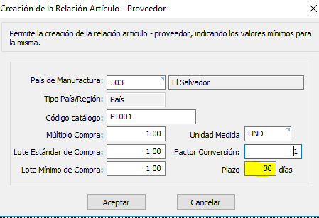 Nota: la primera vez que compres un artículo a un proveedor será necesario definir la información de compra, el campo más relevante a definir es el plazo de días marcado en amarillo, en este campo debes definir la cantidad de días que el proveedor tarda en despacharte el producto. TODOS LOS CAMPOS DEBEN LLENARSE.